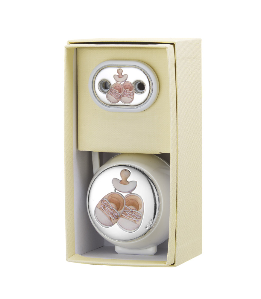 Aplique de metal plateado con detalles de varias figuritas: una de unos zapatos y otra un chupete. Disponible en color blanco.
