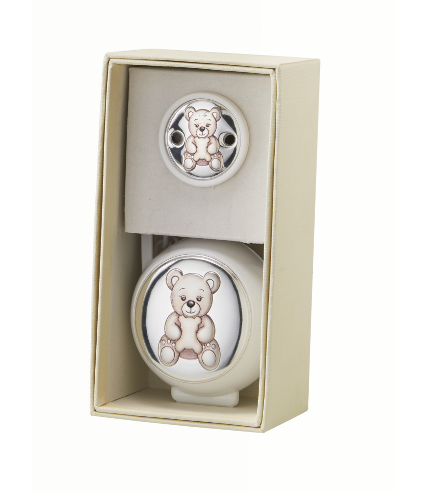 Aplique de metal plateado con detalle de una figurita de un oso abrazando a un osito. Disponible en color blanco.