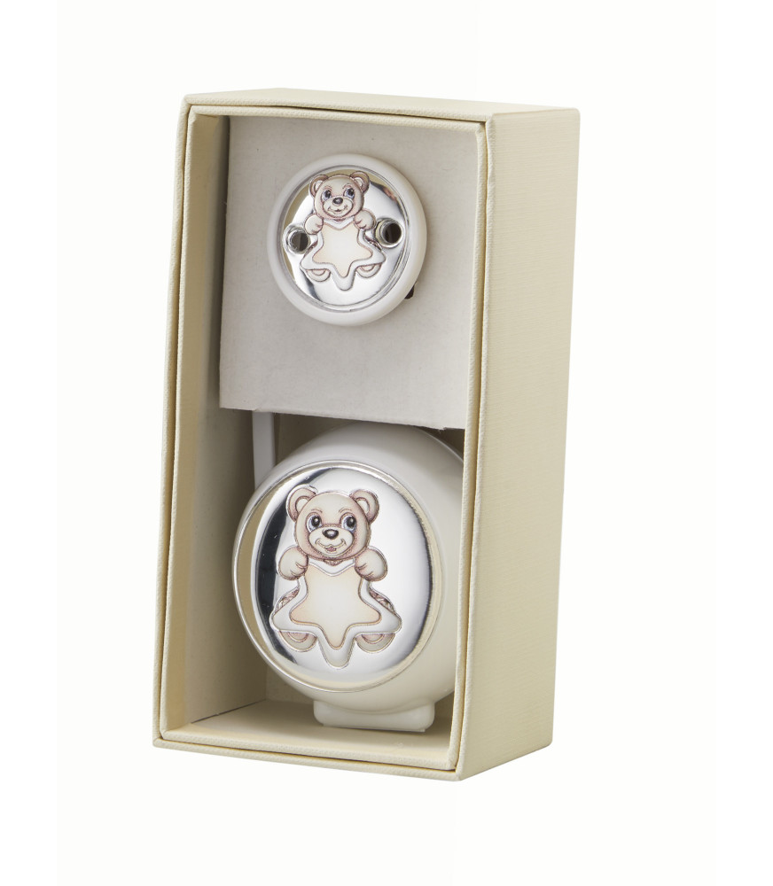 Aplique de metal plateado con detalle de una figurita de un oso abrazando a una estrella. Disponible en color blanco.