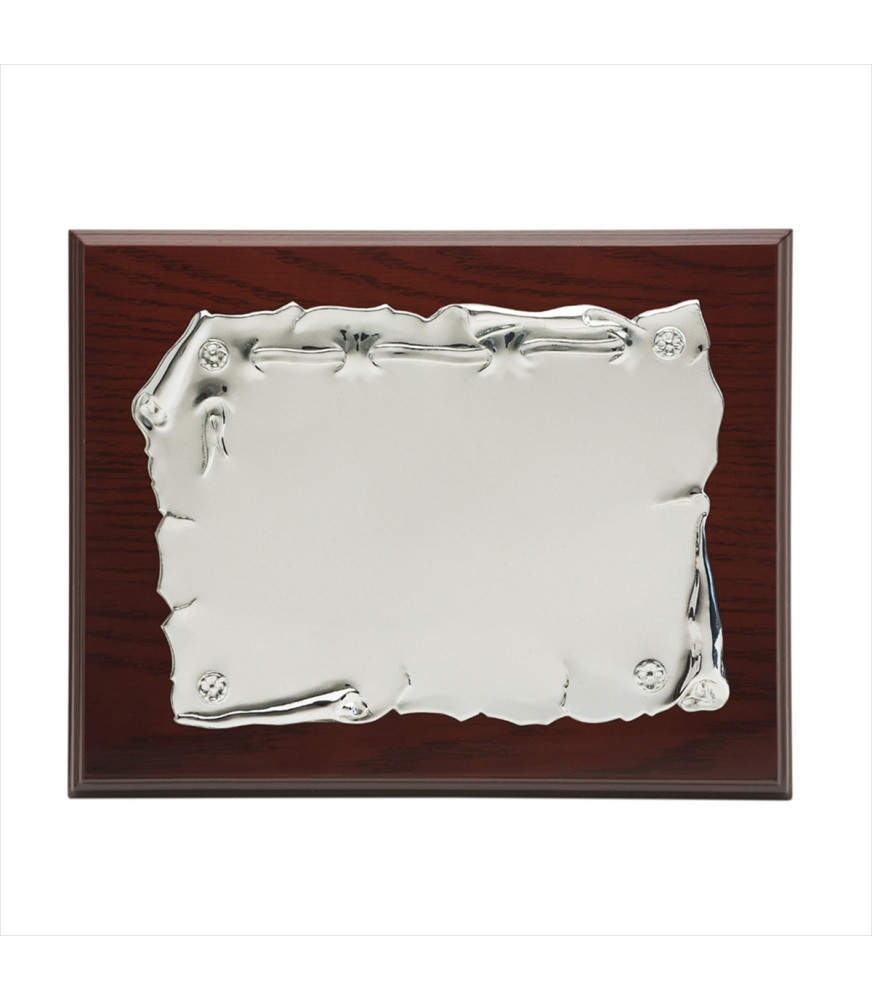 Placa conmemorativa en alpaca, con forma rectángular con forma de pergamino, labrado en el bisel de la placa, acabado mate y peana de madera.