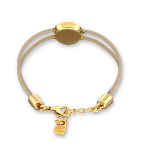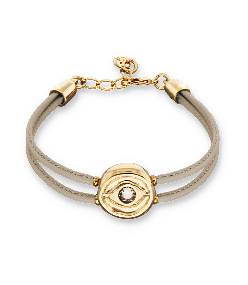 Pulsera Ser Intuitiva UNOde50 PUL2601MFLORO0, pulsera ajustable de doble tira de cuero italiano en color marfil, un tono suave y neutro que simboliza la pureza, la introspección y la elegancia natural. En el centro, una pieza bañada en oro con forma de ojo místico resguarda un cristal blanco facetado que refleja claridad y conexión interior.