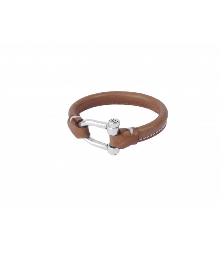 Pulsera Grillete Icon CXC B0009MCA00, una pulsera clásica de cuero color camel con enganche de metal bañado en plata e inspiración ecuestre.