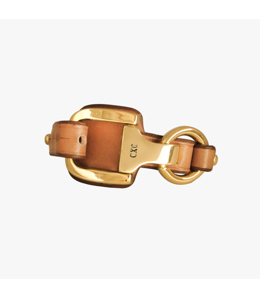 Pulsera Estribo Hickstead Cuero CXC B0188ORC00, pulsera bañada en oro,con Cuero Camel, con canto matado a mano, teñido y lujado con fileteado.