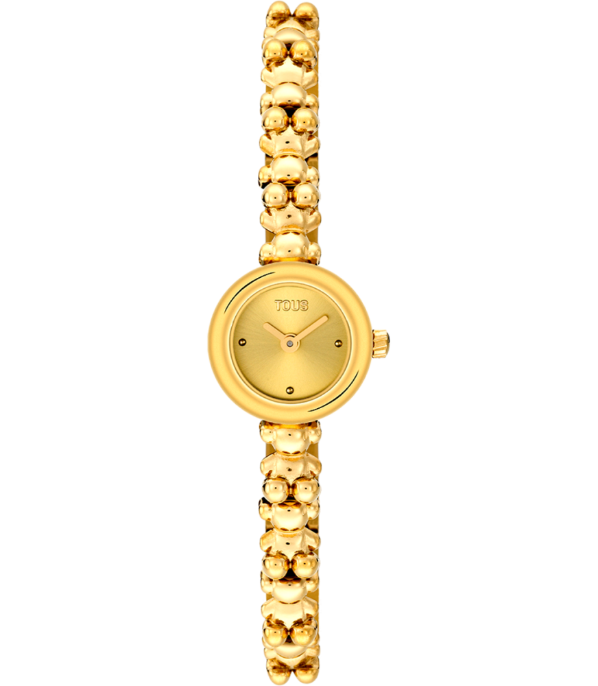Reloj analógico TOUS Bold Bear Round, modelo de caja redonda y con brazalete de acero inoxidable con motivos oso en color dorado. Diámetro: 18 mm. Esfera de metal de latón. Cristal mineral plano redondo. Funciones: hora y minutos. Movimiento analógico de cuarzo japonés. Brazalete de acero (7mm x 7mm x 81,6mm) con detalles en forma de ositos en el armys con cierre de joyeria. Impermeable a 3 ATM.