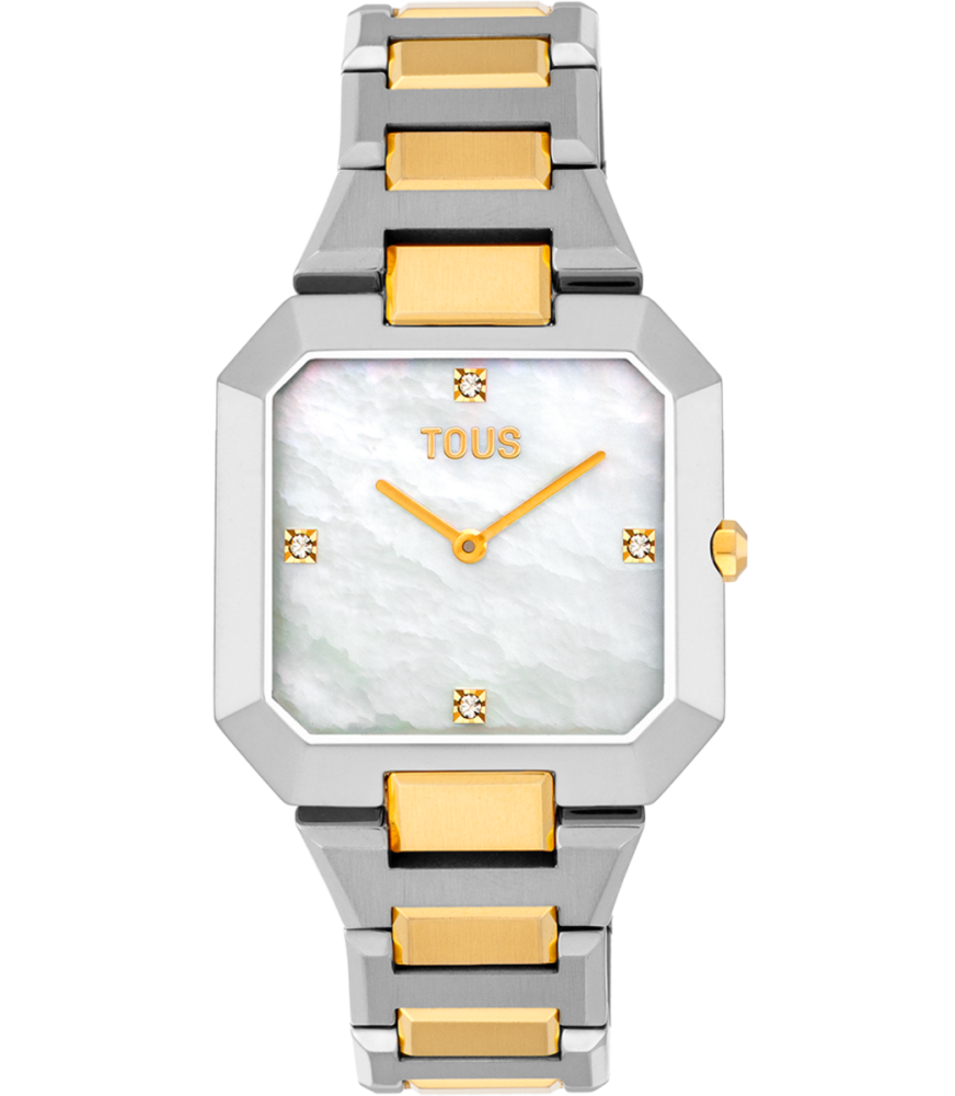Reloj analógico TOUS Karat con brazalete de acero inoxidable y acero dorado. Dimensiones: 30,5 mm. Esfera de nácar con cristales facetados en los índices. Cristal mineral plano octogonal. Funciones: hora y minutos. Movimiento analógico de cuarzo japonés. Brazalete bicolor en acero tipo armys (86,9mm x 21,3mm x 16mm / 77,2mm x 21,3mm x 16mm). Cierre mariposa con pulsadores. Impermeable a 3 ATM.