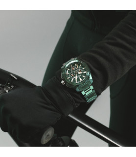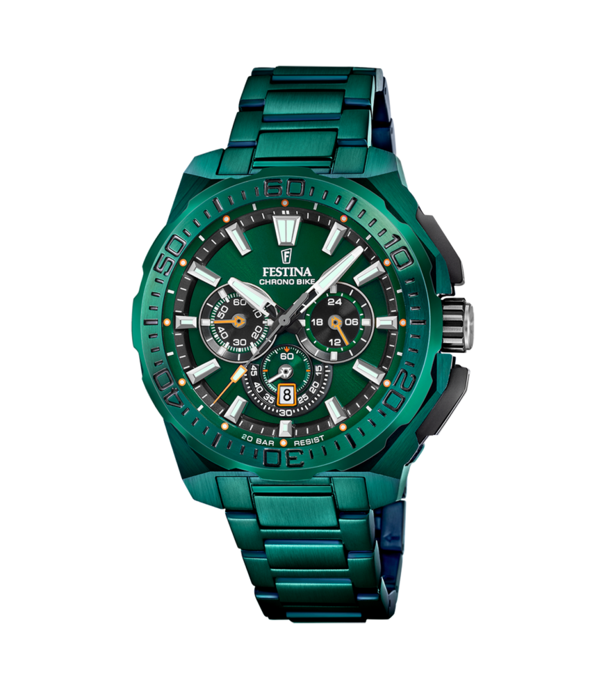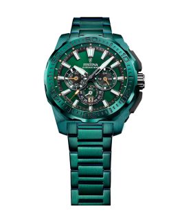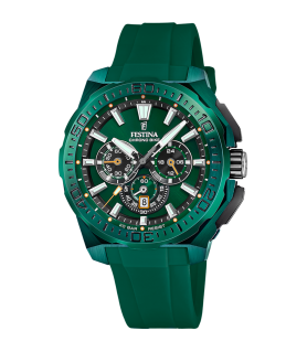 Reloj Festina Special Editions Chrono Bike Hombre F20730/1 . Con caja de acero inoxidable Ip en color verde, equipado con Armys en acero Inoxidable 316L Ip en color verde. La esfera en color verde, con índices en plateado y luminiscentes, como las agujas, con tres subesferas a las 3,6 y las 9 horas. La resistencia al agua es de 200 metros (20 ATM). Tipo de cierre desplegable con pulsadores.