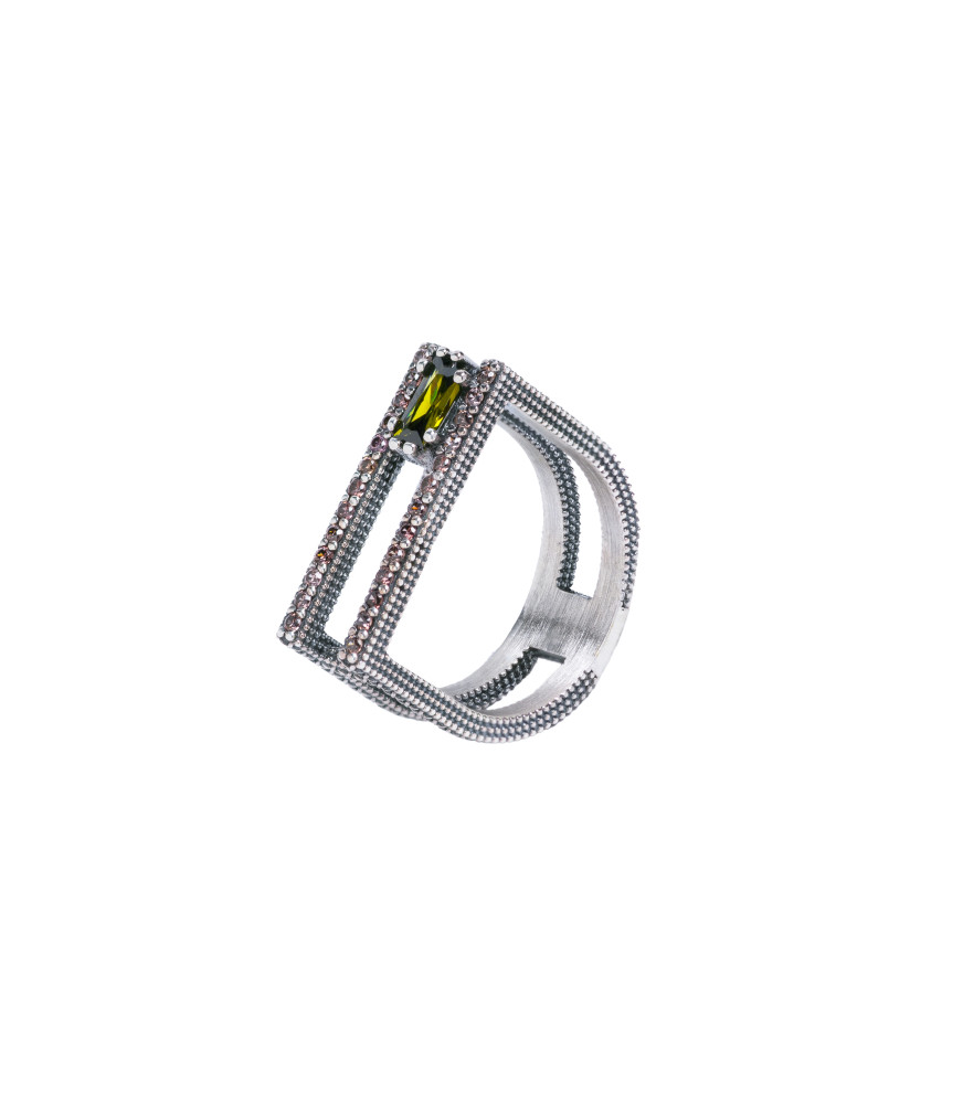 Anillo Sunfield Chloé Baguette AN065421, anillo de inspiración arquitectónica y diseño contemporáneo, disponible en plata. Presenta acabado texturizado con circonitas brown en los bordes y una baguette central en verde peridoto.