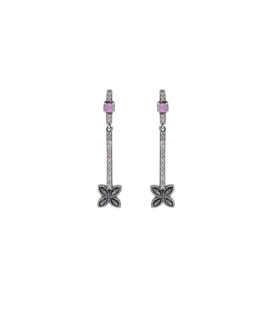 Pendientes Juliette Flower PE065583, pendientes de plata artesanal de estilo geométrico y floral. La parte superior luce cabujones de cuarzo rosa enmarcados por circonitas cava, y una línea de circonitas culmina en una flor con circonitas verde peridoto.