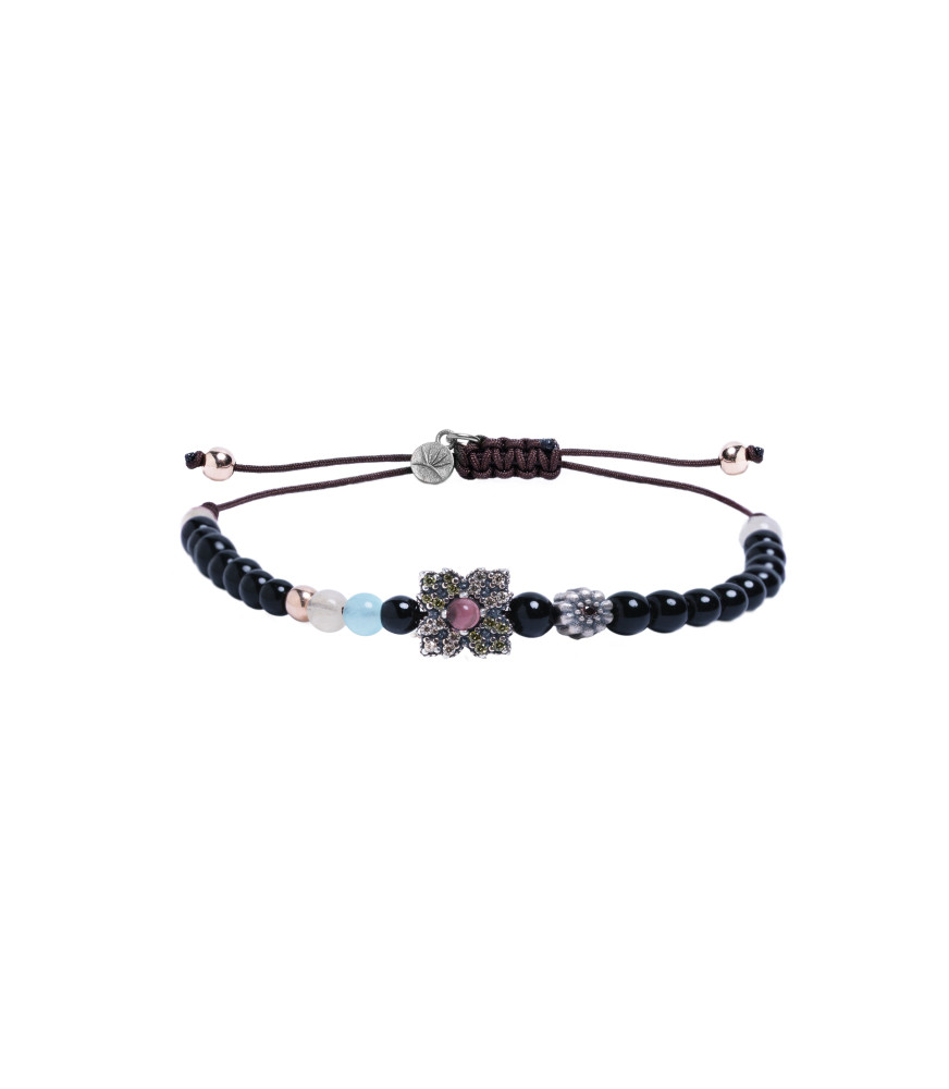 Pulsera Claire Blumen PU065562, pulsera ajustable con cuentas de piedras naturales y motivo floral en plata, con ónix, circonitas verde peridoto y cabujón rosa.