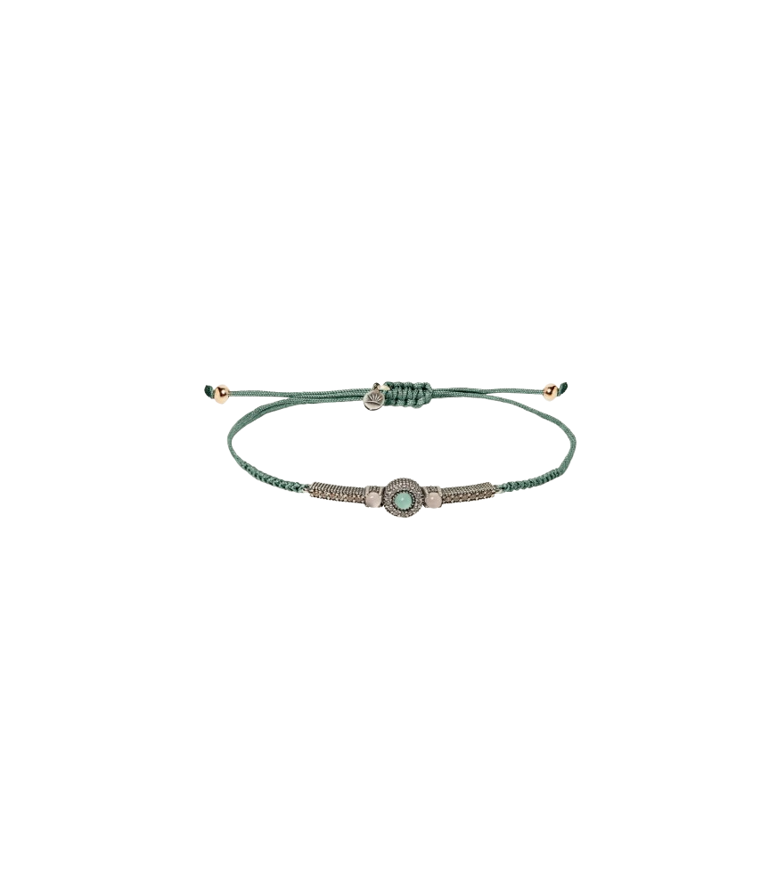 Se cierra mediante un macramé ajustable de nylon turquesa, para mayor comodidad y las bolitas que completan el conjunto son de plata con baño de oro rosa de 24 kt.