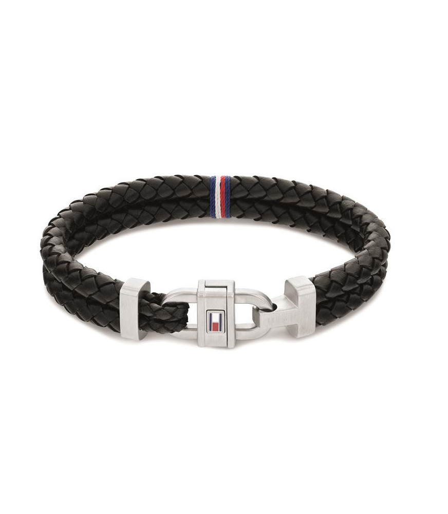 Pulsera para Hombre Tommy Hilfiger 2790361, fabricada en una doble correa de cuero trenzado negro unida por nylon con los colores de la bandera Tommy.