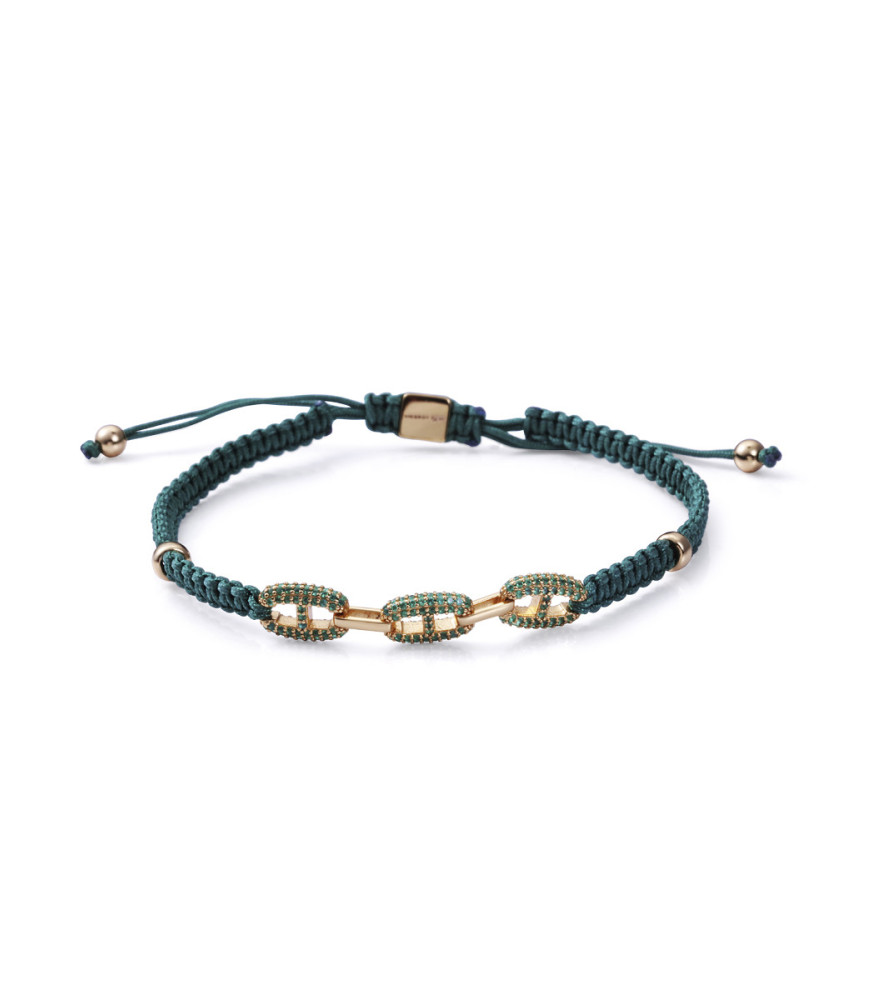 Pulsera Viceroy Hombre 13255P100-32, en plata de primera ley con un baño de oro, esta pieza se destaca por su cordón verde vibrante, que aporta un toque de color único. Los eslabones adornados con circonitas verdes aportan destellos de luz que complementan perfectamente el diseño, creando un contraste armónico con el baño de oro. Con un largo ajustable de 18 a 26 cm, se adapta cómodamente a la muñeca, brindando versatilidad y estilo.