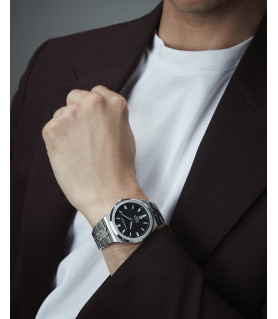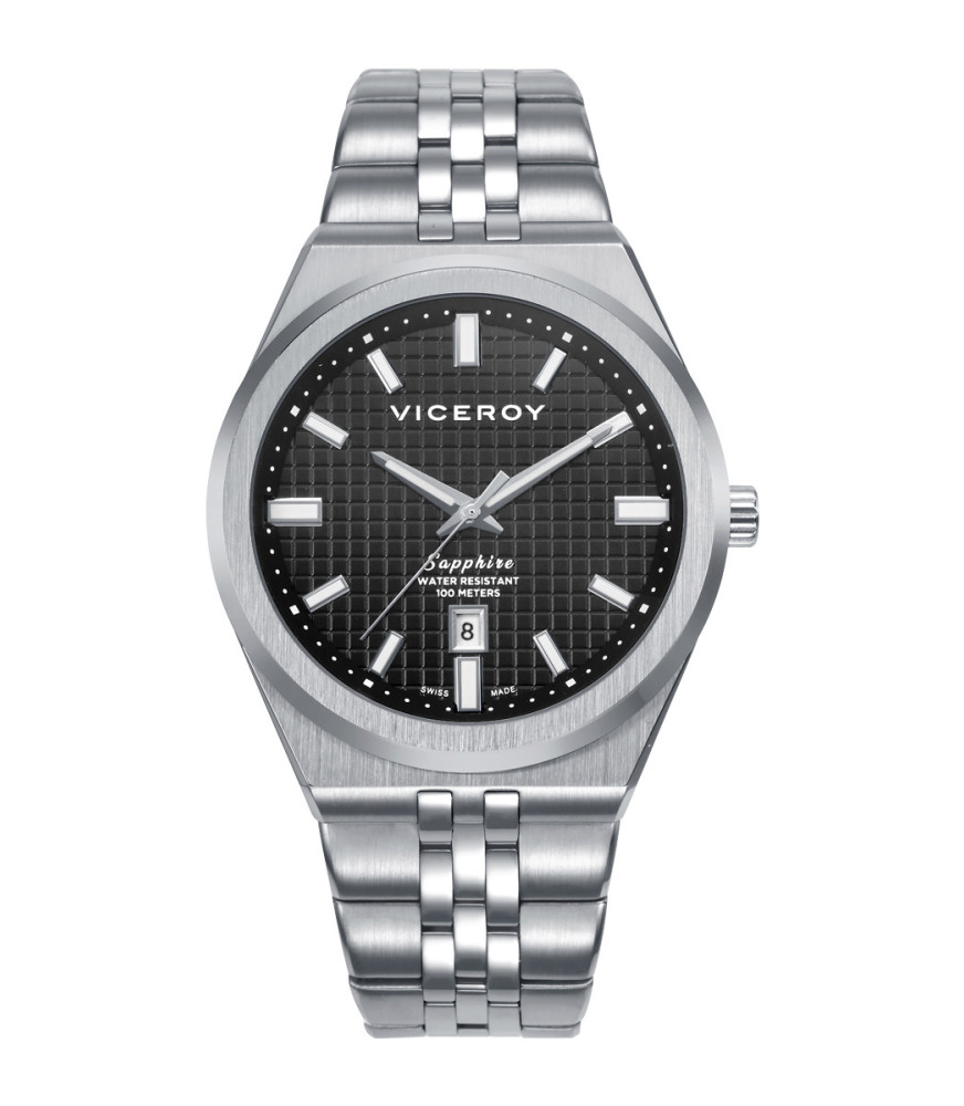 Reloj de Hombre Viceroy Swiss Made 45115-57, maquinaria de cuarzo suizo, tres agujas, calendario a las 6 horas, caja de acero de 41 mm y esfera en negro embellecida con un cristal de zafiro. Brazalete de tipo armys en acero en mate y brillo y con cierre oculto desplegable. Fondo a rosca y sumergible a 10 ATM.