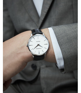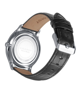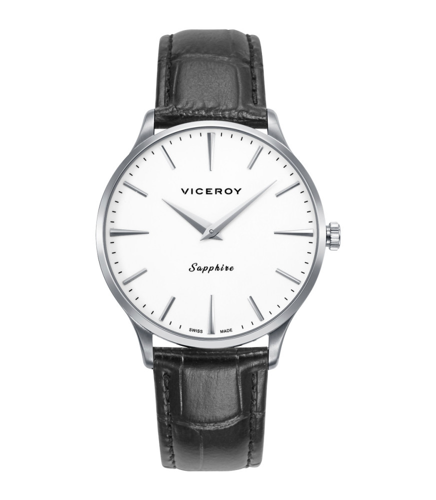 Reloj de Hombre Viceroy Swiss Made 45117-07, maquinaria de cuarzo suizo, dos agujas, caja de acero de 40 mm con bisel liso en acero y esfera en color blanco. Brazalete de piel labrada en color negro y con cierre de hebilla. Fondo a presión y sumergible a 5ATM.